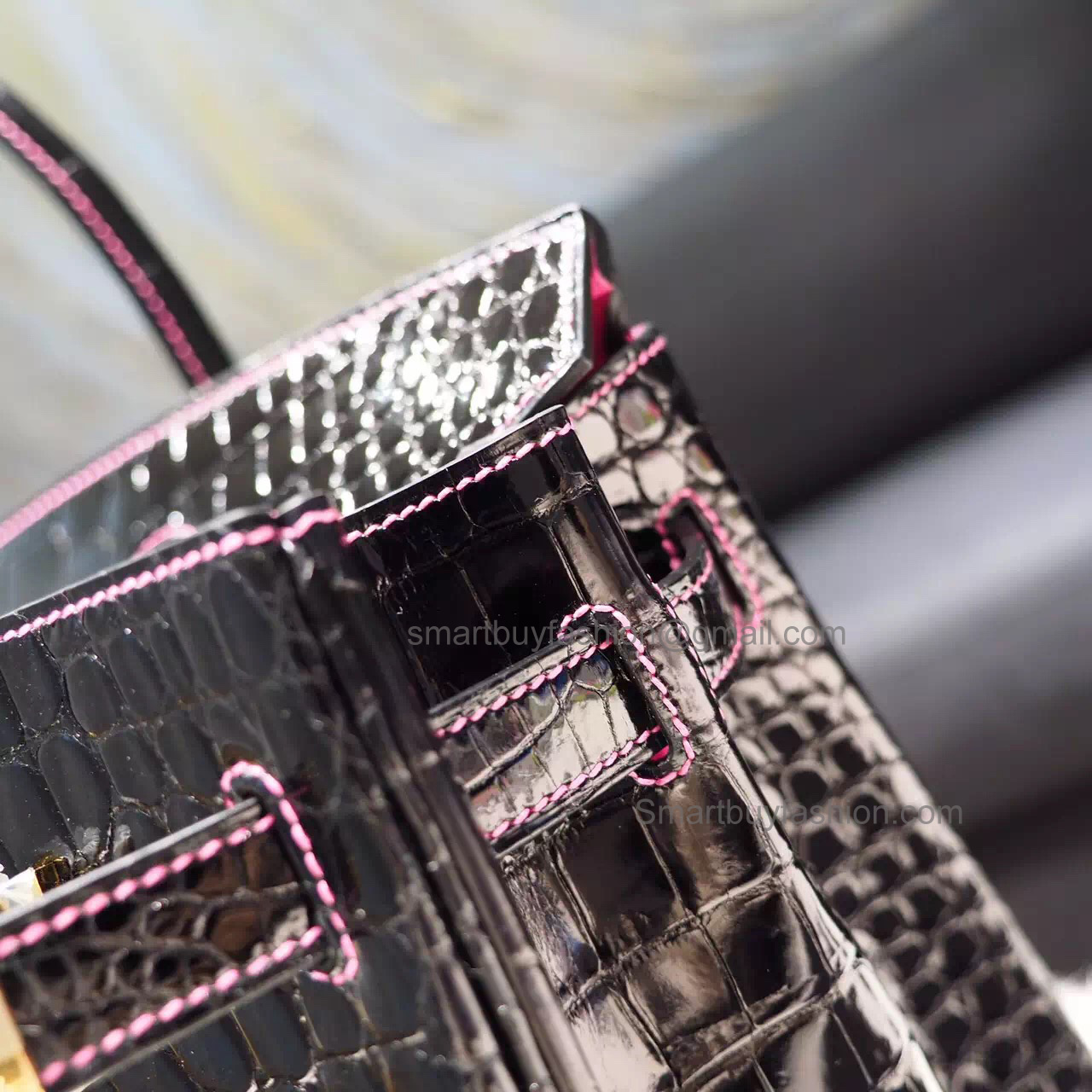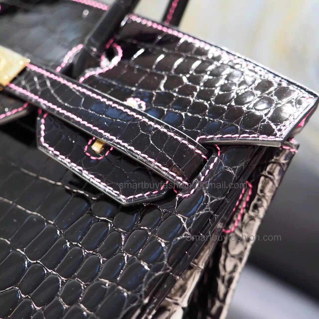 Hand Stitched Hermes Birkin 30 Bag in Bicolored ck89 Noir Shining Porosus Croc GHW