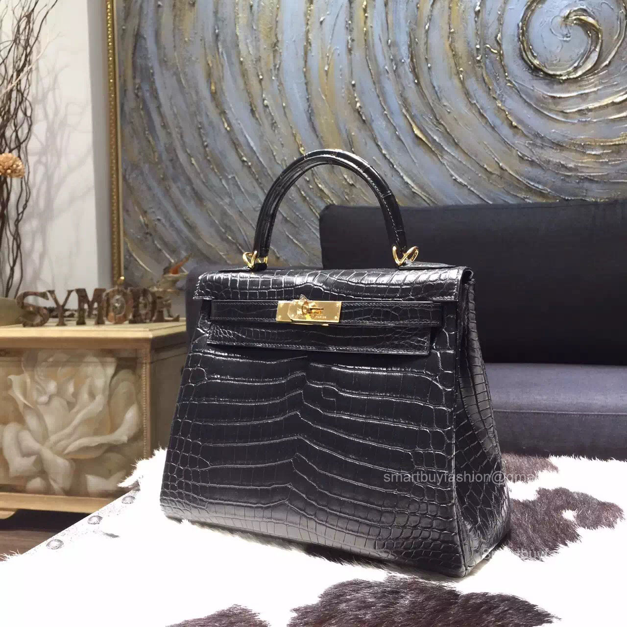 Hermes Kelly 28 Bag Black Crocodile Leather Handstitched Silver hw