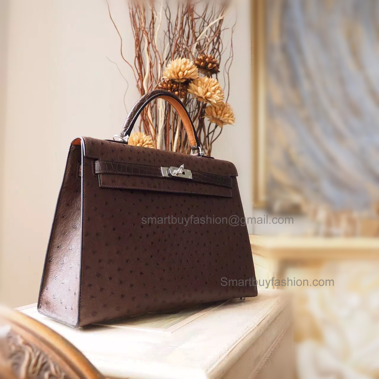 Replica Hermes Kelly 35 Bag Handmade in ck47 Chocolate Ostich PHW