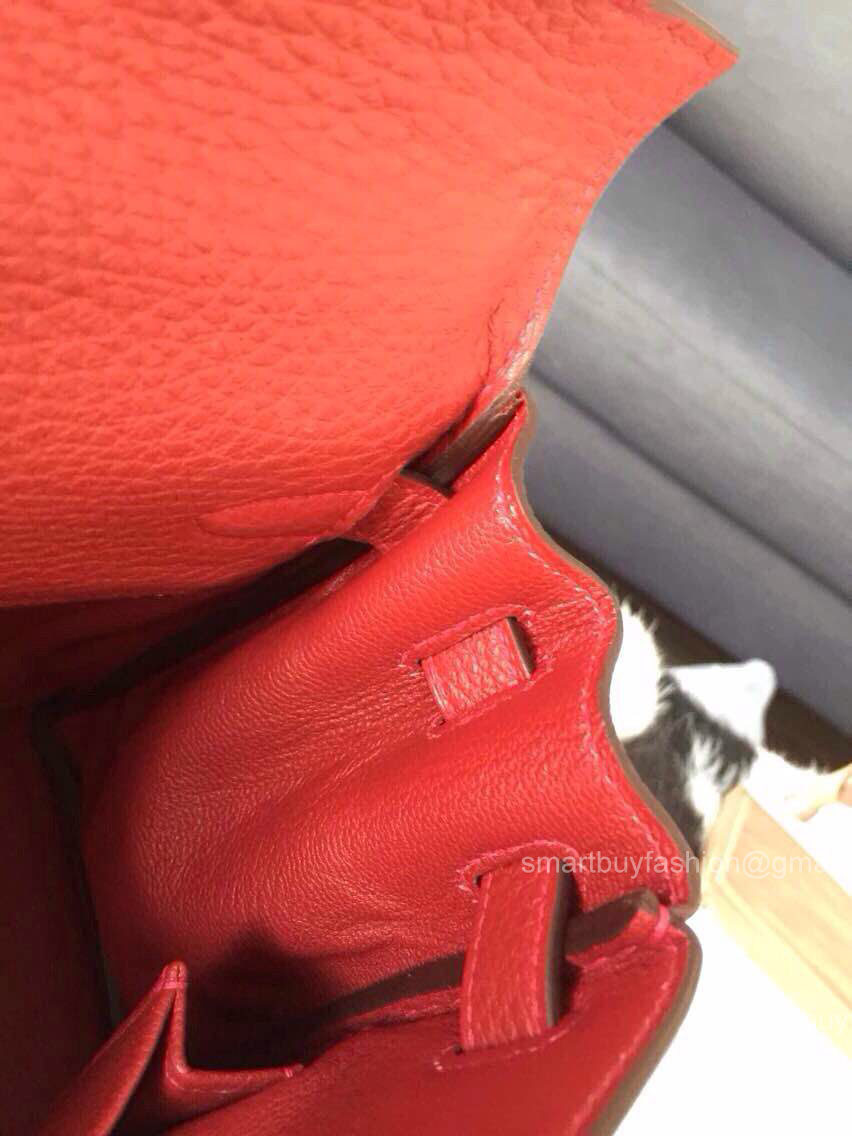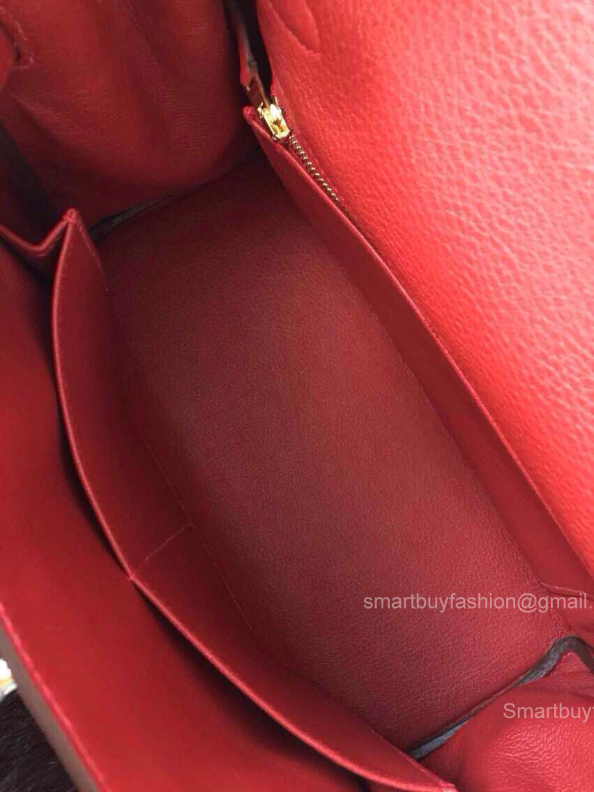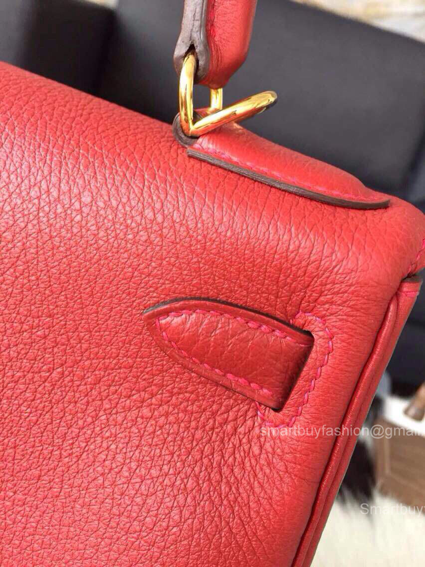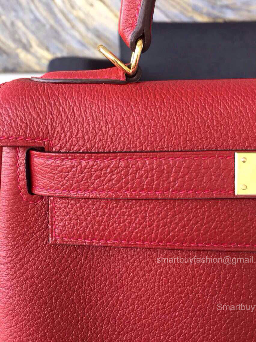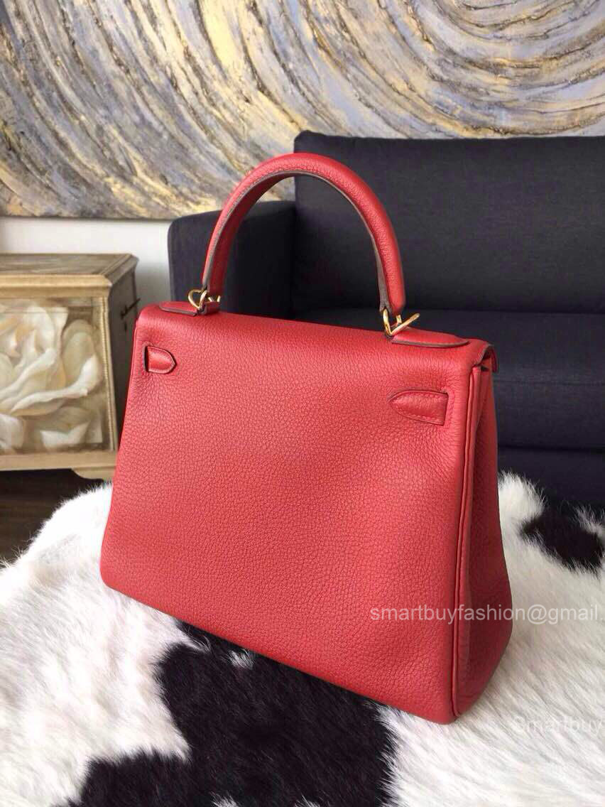 Hermes Kelly 32 Rouge Garance CK54 Togo Leather Handstitched Gold hw
